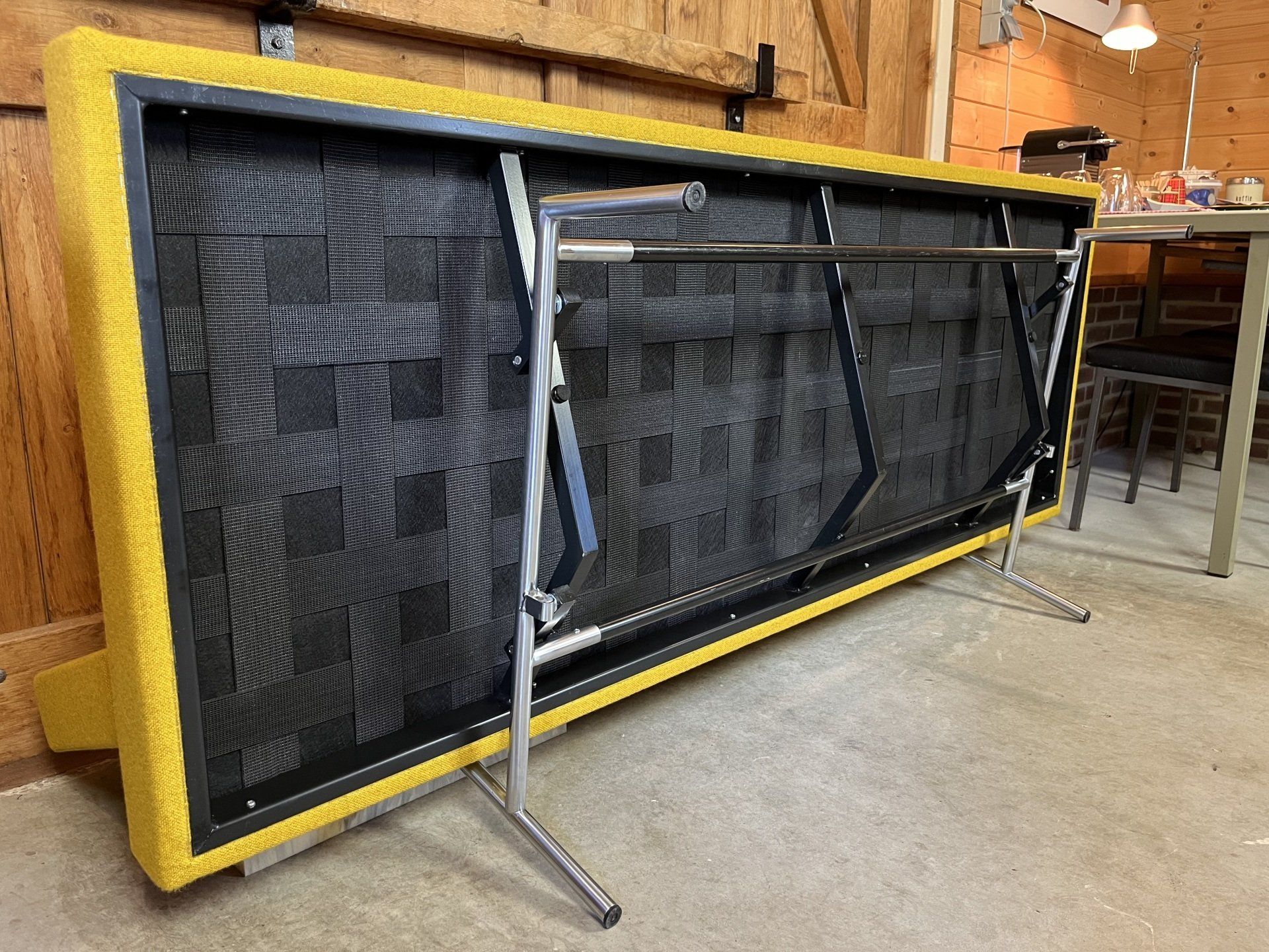 De bank wordt volledig gedemonteerd, waarbij alle oude onderdelen worden verwijderd